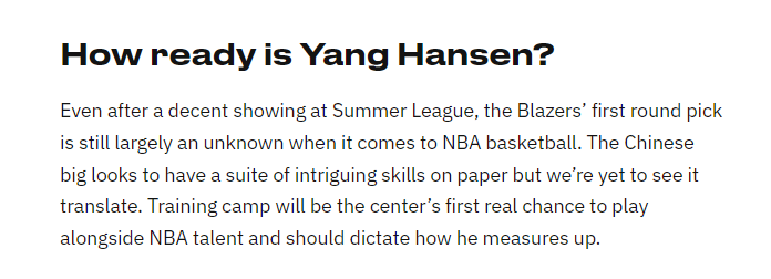 北京时间8月24日,开拓者媒体Blazer's Edge对一个月后的训练营进行了前瞻解析,其中提到了中国球员杨瀚森——